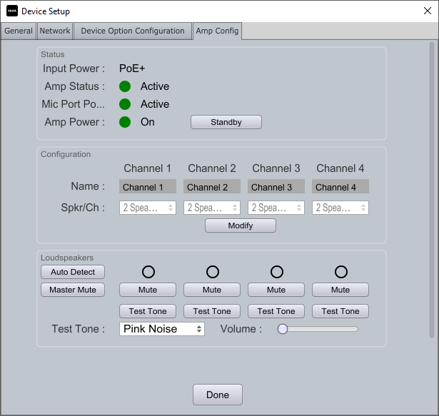 If you're experiencing no audio through your Sonia speakers, check the following using the Amp Config tab (access by double-clicking the Sonia Amp device tile in Network view):